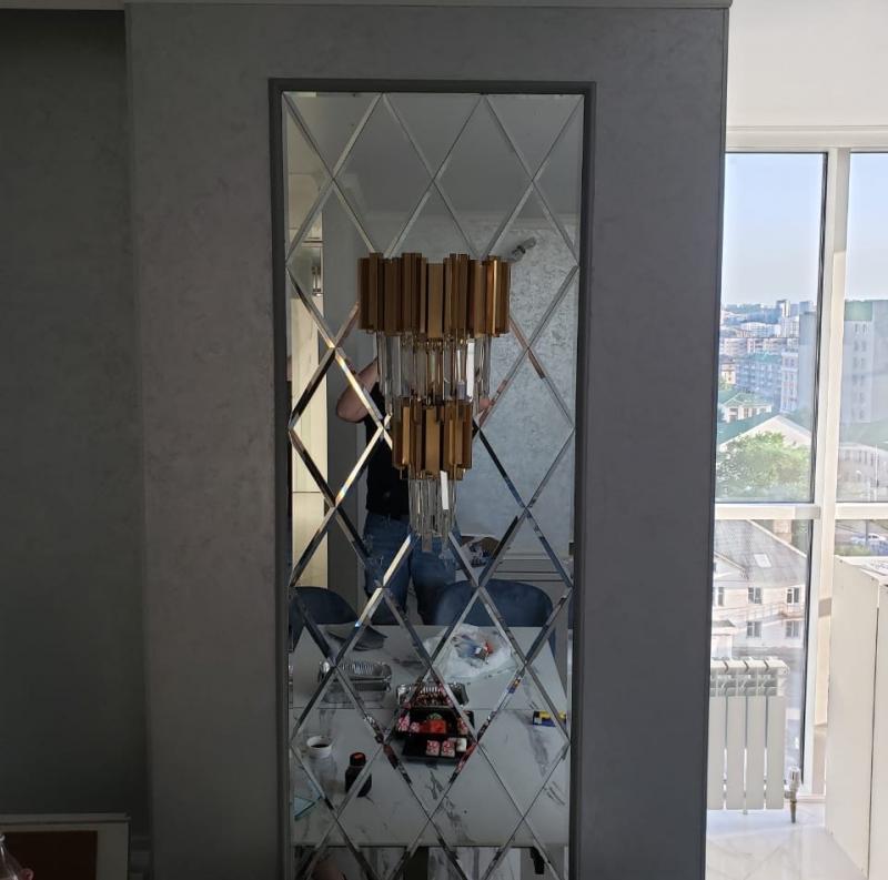 Использована серебристая квадратная зеркальная плитка размером 18х18.
